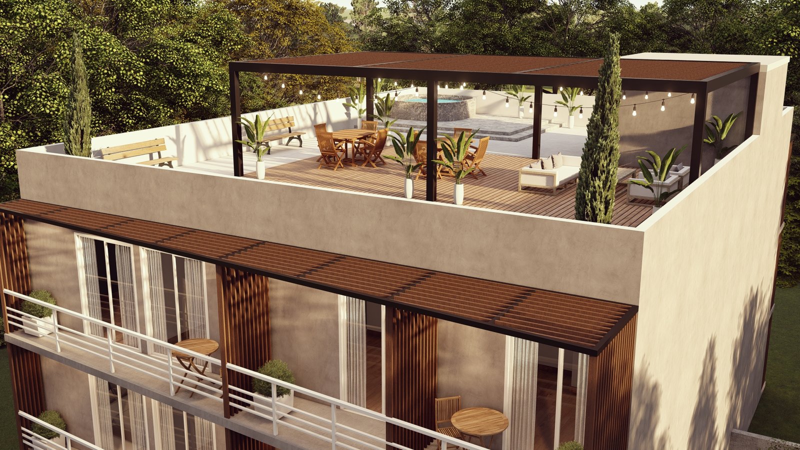 • Nivel Superior (Terraza): Terraza amplia, ideal para reuniones, vistas abiertas y ventilación natural.